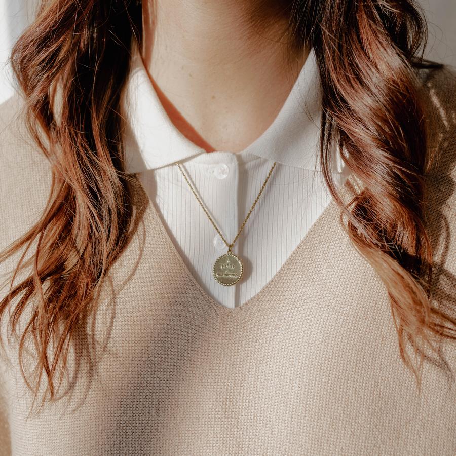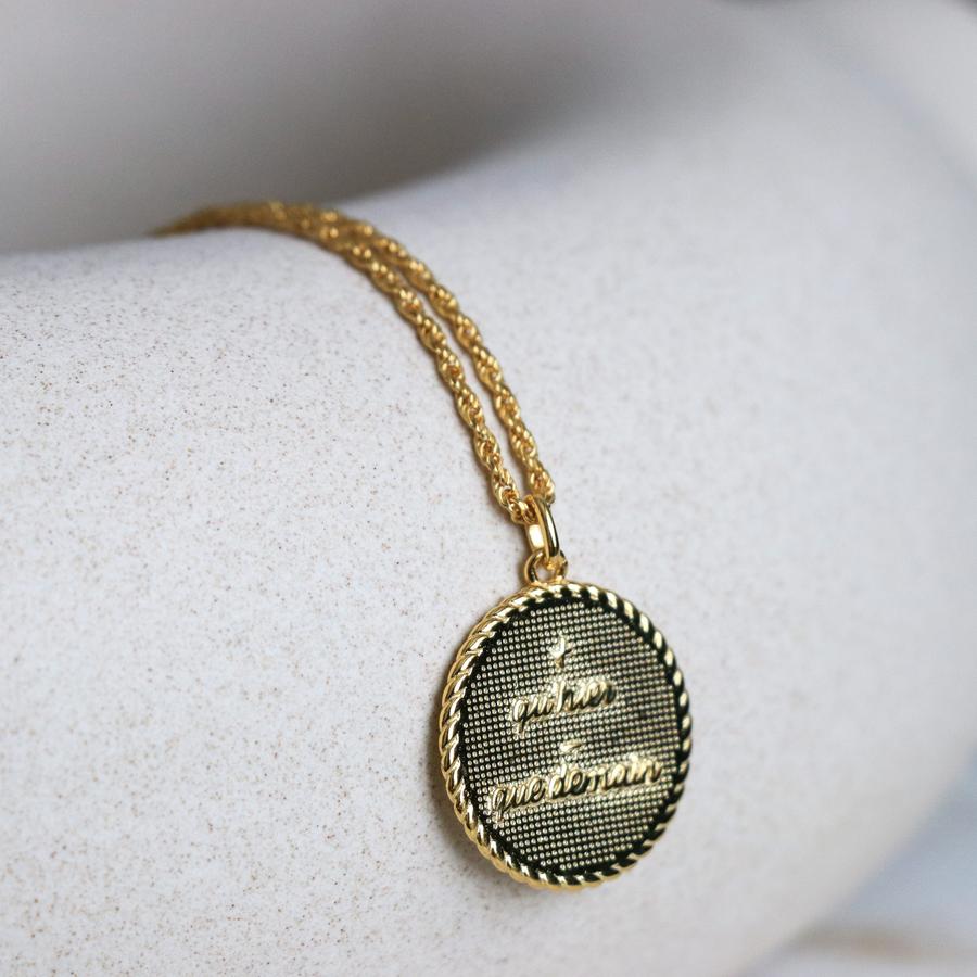 Collier en torsadée argent sterling .925 plaqué or 18K orné d'un médaillon texturé inscrit : + qu'hier - que demain.