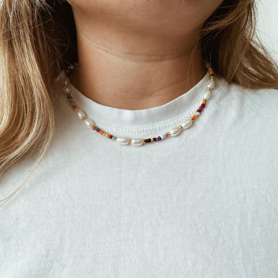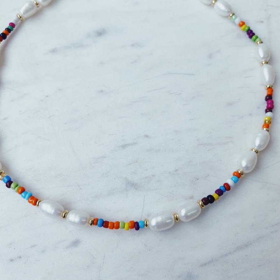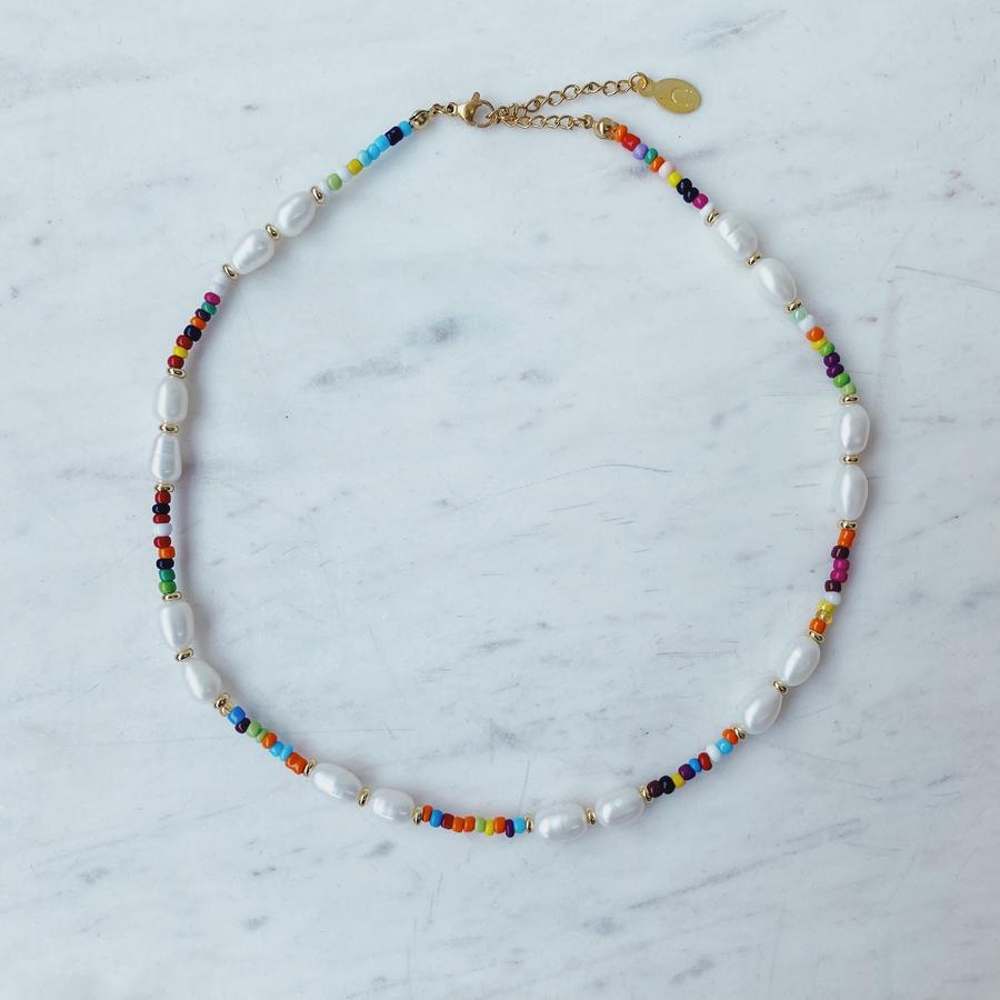 Collier en billes multicolores et perles d'eau douce avec attache en stainless plaquée or.